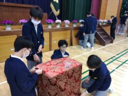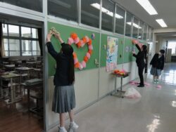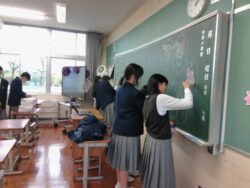 新たな学年担当教員も加わった学級活動を終え、午後からは翌日の入学式準備に取りかかりました。生徒一人一人がよく動き、積極的に準備してくれたおかげで、スムーズに会場や教室が整いました。