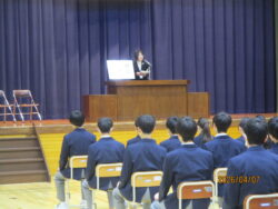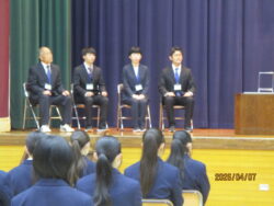 在校生と教職員がそろったところで始業式です。式辞では、3月に離任された先生方が残された言葉を振り返り、チームとしての集団づくりについて考えました。